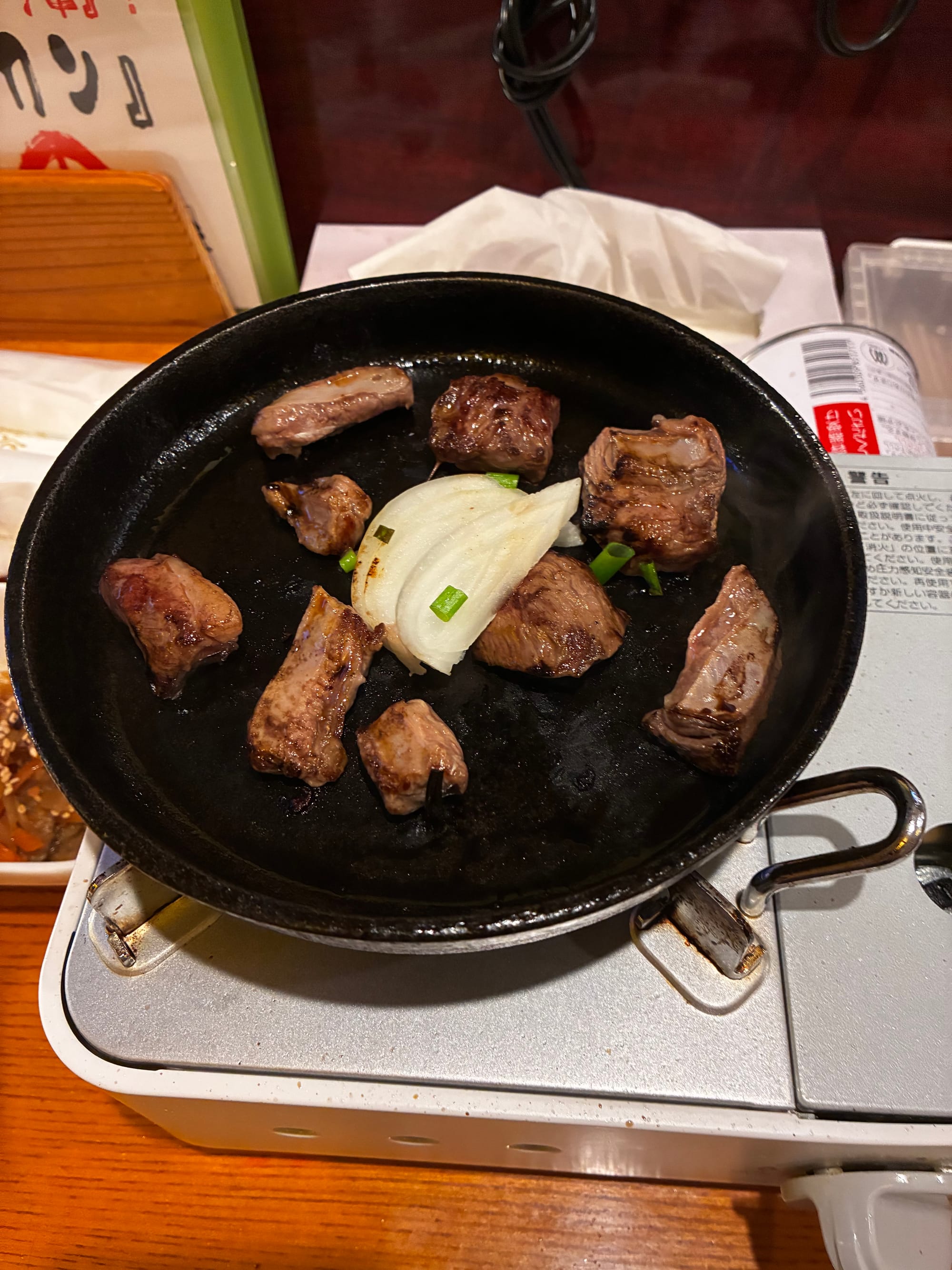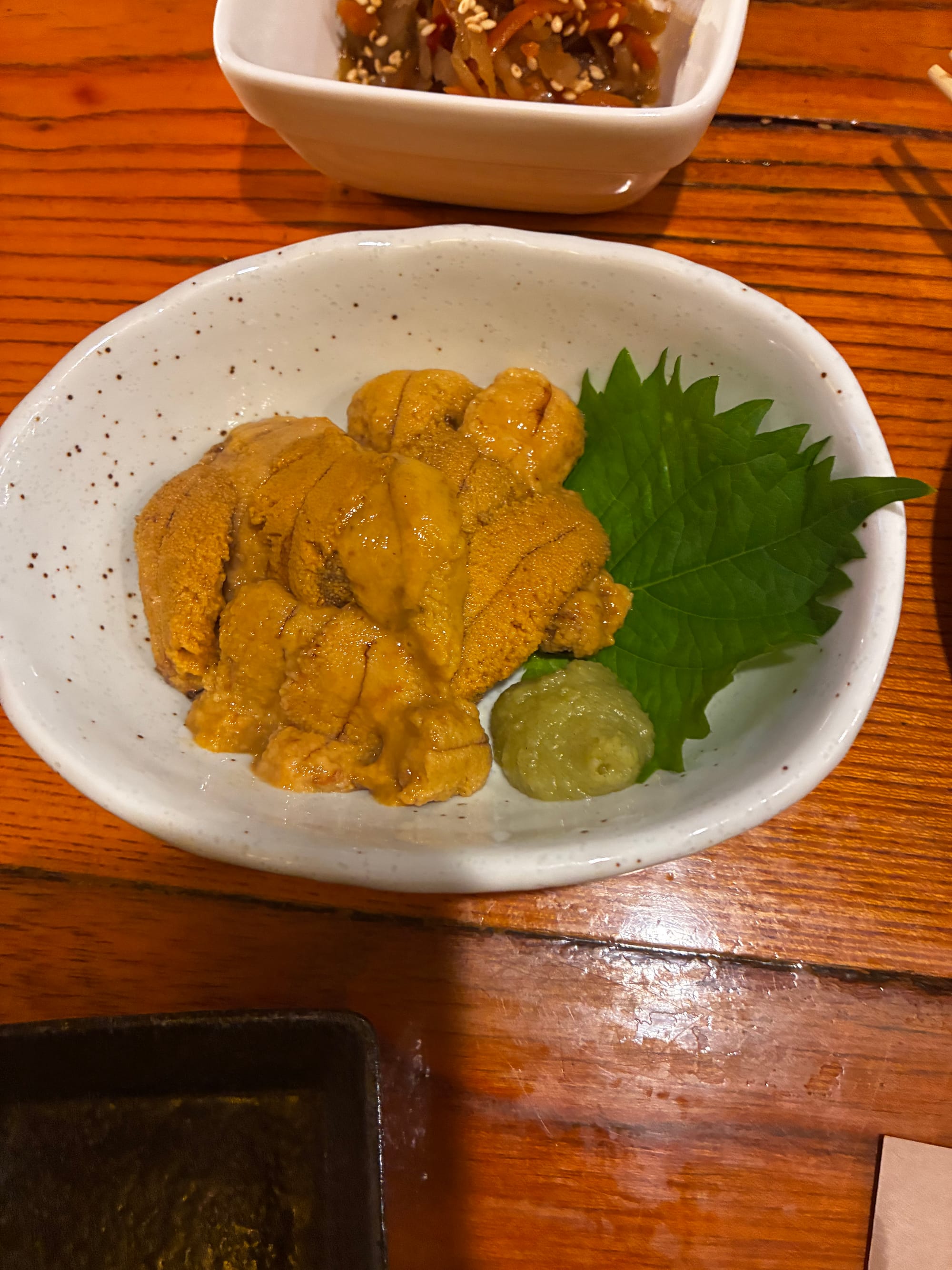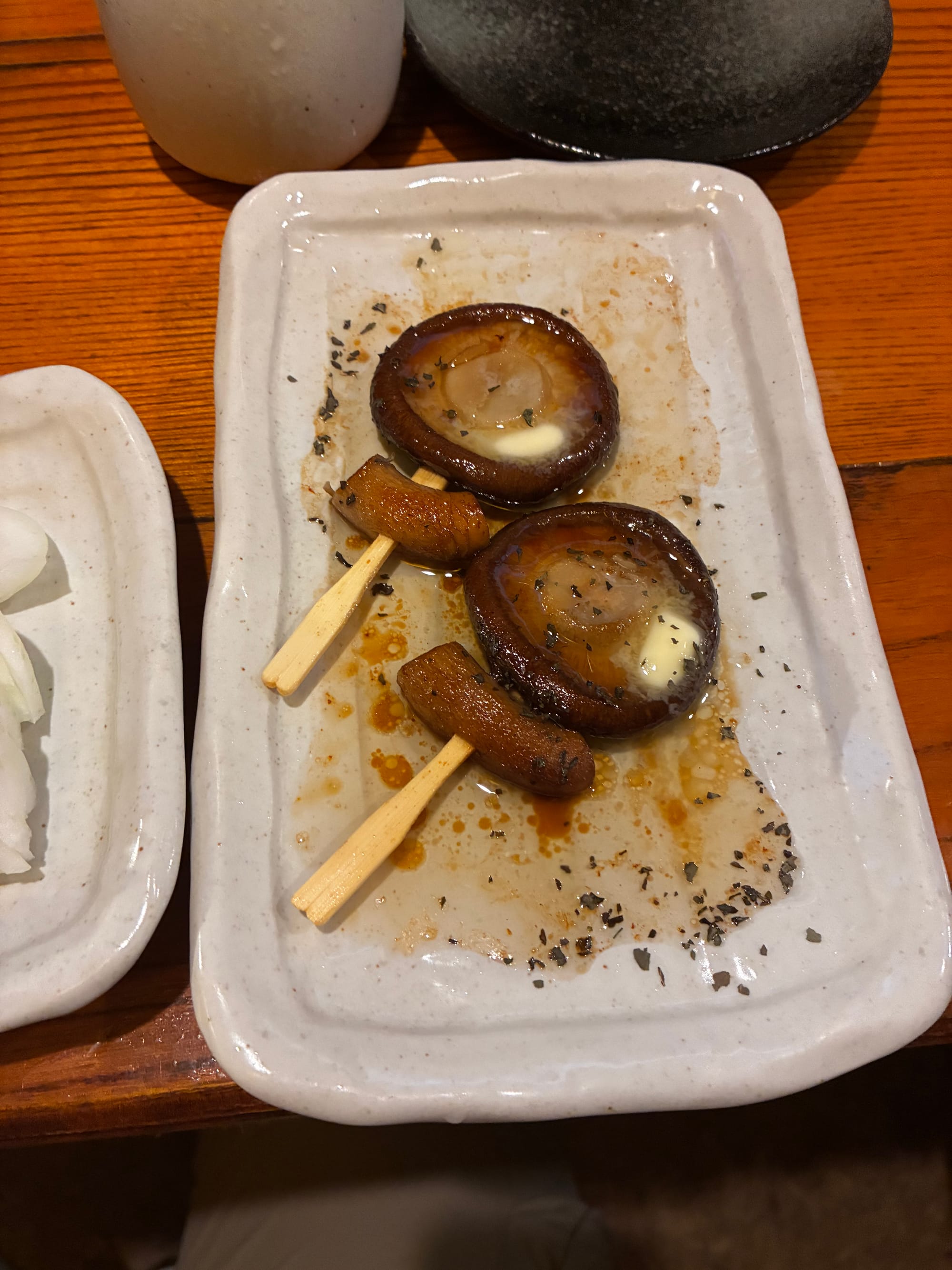 在酒店楼下看到家做烤串和铁板烧肉的. 叫了海胆刺身, 烤蘑菇和鸡皮. 铁板要了鹿肉和羊肉. 烤串味道都很棒. 海胆不如中午的. 鹿肉不知道怎么评价, 可能是我没烤好? 或者熟度掌握有问题? 羊肉倒是还行.