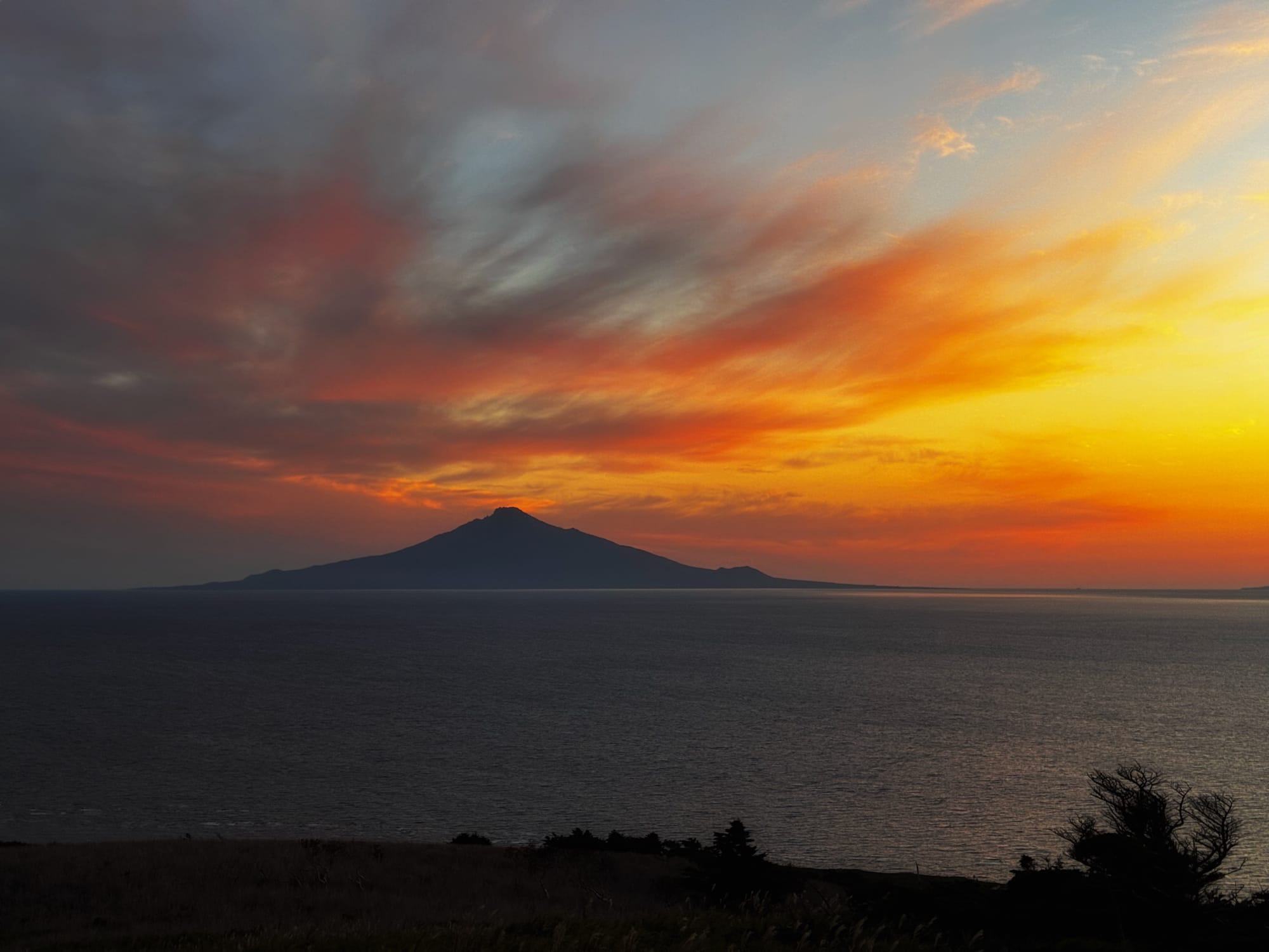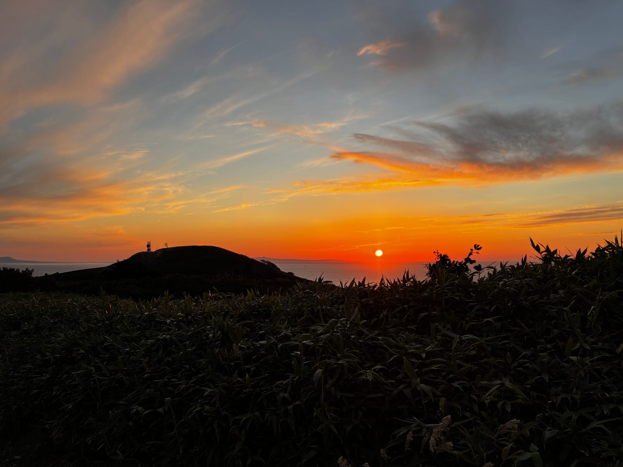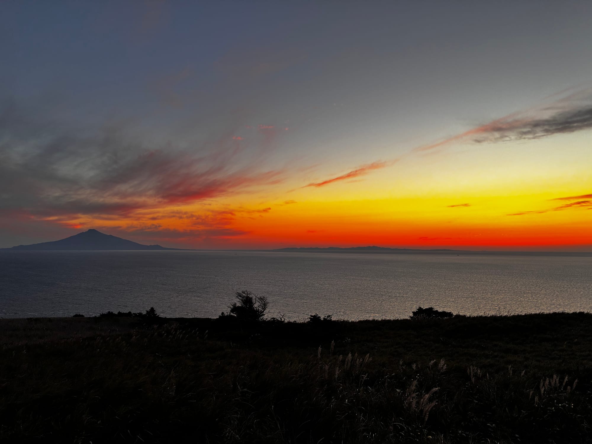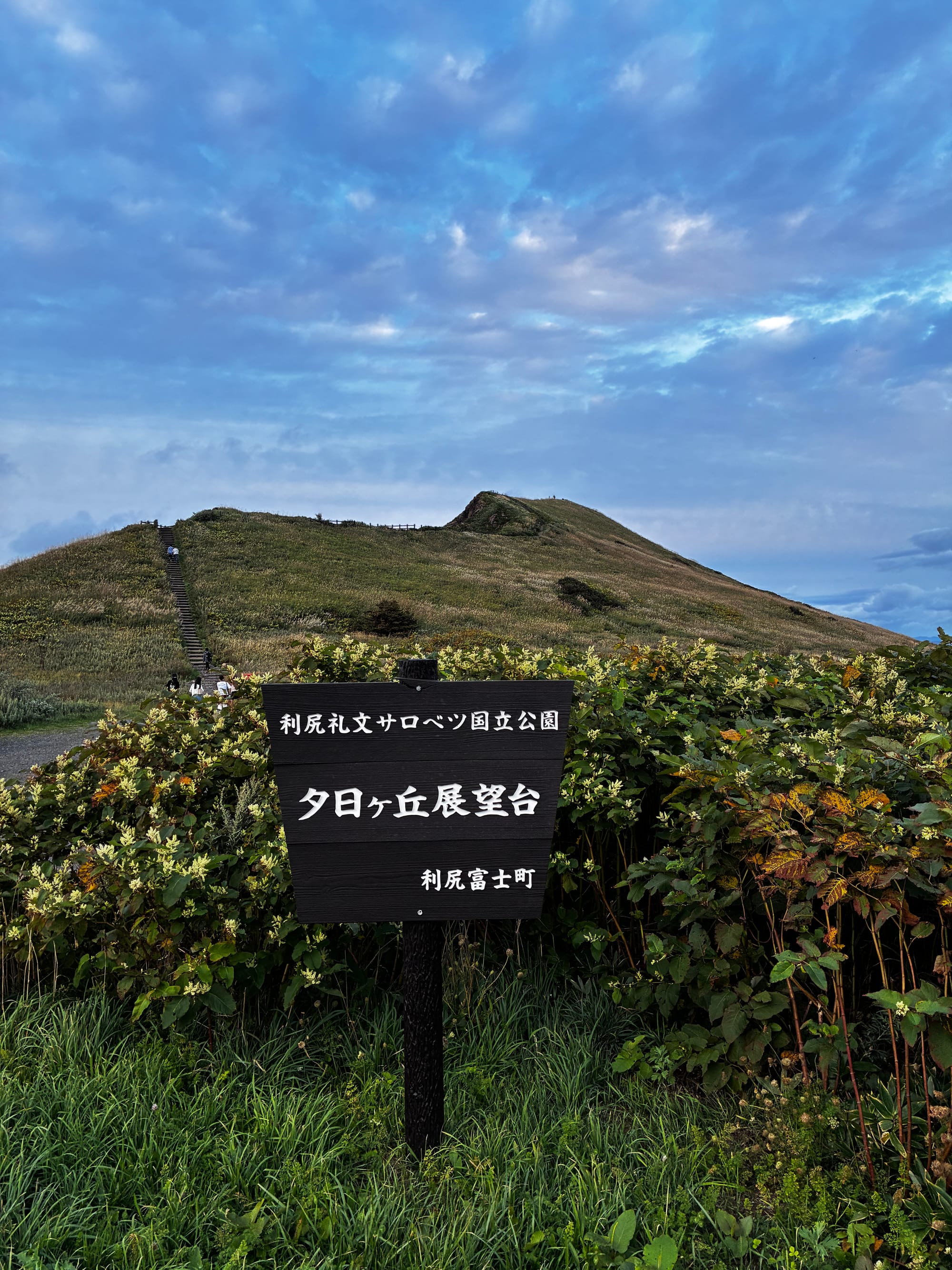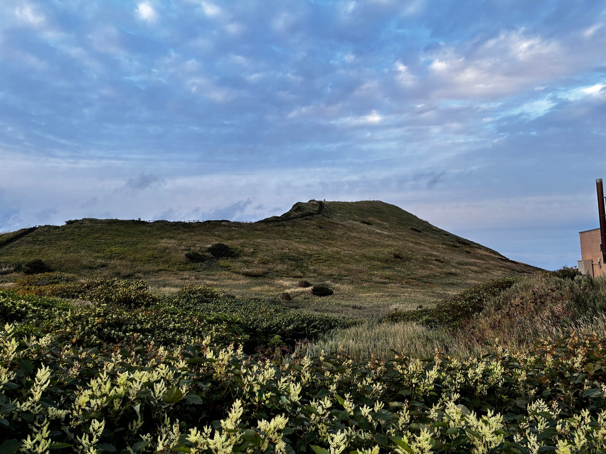 走到原本计划的展望台的时候发现视野不太好. 海面被山遮住了. 赶紧翻地图看看. 找到附近另一个看起来比较靠谱的点, 找好方向就可以直奔过去了. 但是过去只有碎石路. 应该是用于维护设施的临时路. 一路看着表, 加上前两天在礼文习惯了野路的脚步, 紧赶慢赶还是晚了两分钟.